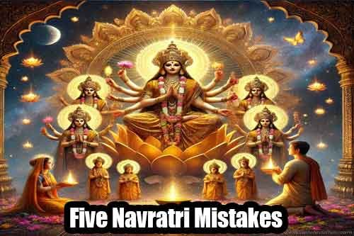 Five Navratri Mistakes नवरात्रि का पर्व पूरे भारतवर्ष में श्रद्धा और भक्ति के साथ मनाया जाता है। माना जाता है कि इन 9 दिनों में माँ दुर्गा की उपासना करने से मनचाही सिद्धि, शक्ति और सफलता प्राप्त होती है। लेकिन अक्सर साधक अनजाने में कुछ ऐसी गलतियाँ कर बैठते हैं जिनसे उनकी पूजा का फल कम हो जाता है या कभी-कभी पूरी साधना ही व्यर्थ चली जाती है।